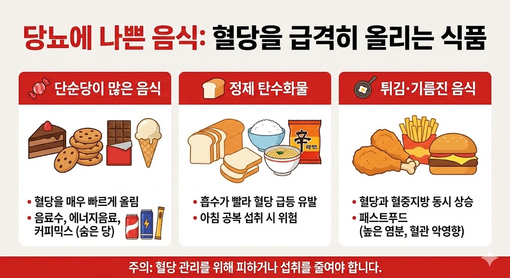 이 식품들은 혈당 조절을 어렵게 만들어 당뇨에 좋은 음식과 나쁜 음식 중 ‘피해야 할 음식’으로 분류됩니다.