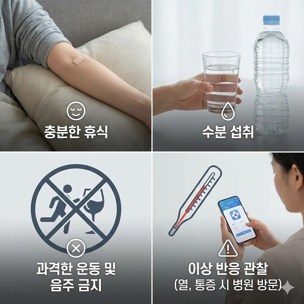 - 음주는 면역 형성에 부정적인 영향을 줄 수 있어 최소 48시간은 금주를 권장합니다.