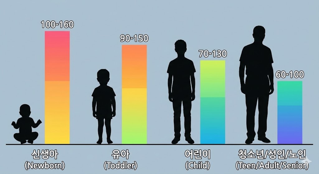 맥박은 연령에 따라 차이가 있습니다. 특히 성장기에는 심장이 빠르게 뛰는 것이 자연스럽기 때문에 기준이 다르게 적용됩니다. 아래 표는 일반적인 범위입니다.