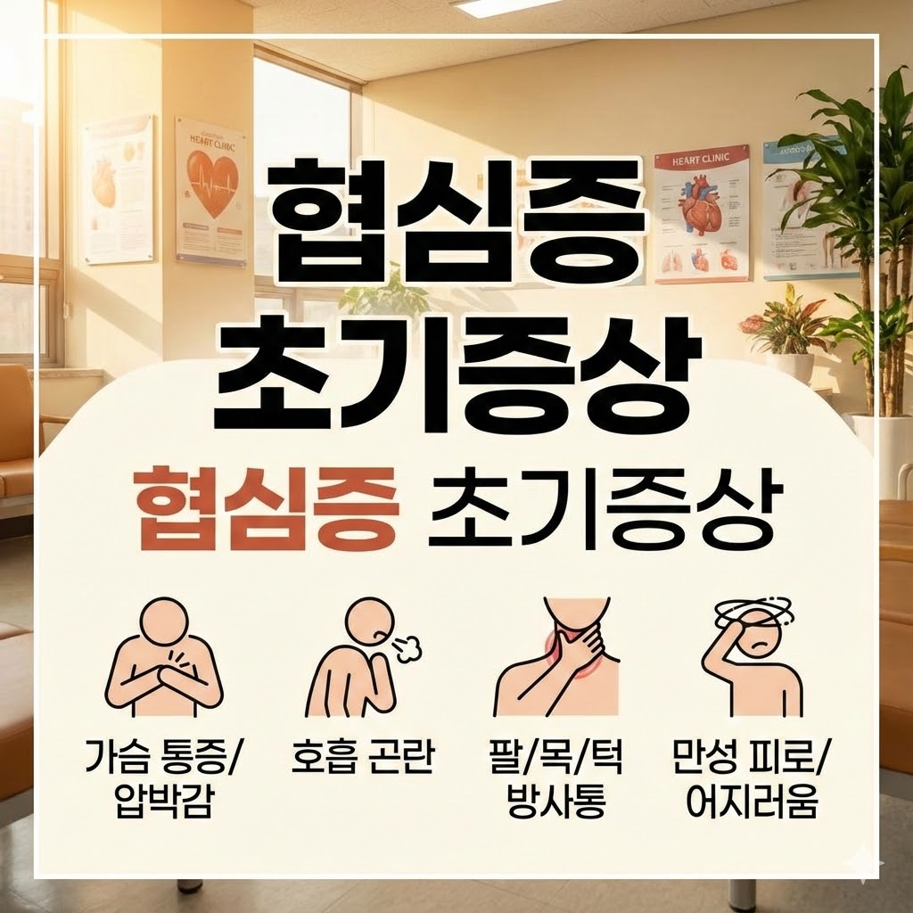 협심증 초기증상은 심장 혈관이 좁아지면서 혈액 공급이 원활하지 않을 때 나타나는 중요한 신호입니다. 보통 가슴 통증만 떠올리기 쉽지만, 실제로는 다양한 신체 변화가 동반될 수 있어 초기 단계에서 알아차리는 것이 무엇보다 중요합니다. 이 글에서는 일상에서 쉽게 지나칠 수 있는 협심증 초기증상을 중심으로, 원인·위험요인·예방 팁까지 종합적으로 정리해 드립니다.